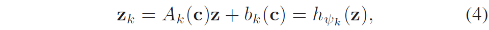 저자들은 다양한 임베딩 벡터를 생성하기 위해 우선 선형 변환을 통해 임베딩 벡터 z를 직교 축으로 투영하였다고 합니다. 여기서 각 투영된 벡터는 하나의 주행 가능 영역에 대응한다고 하네요. 그리고 아래 수식을 통해 c에 대한 경로들을 생성합니다.