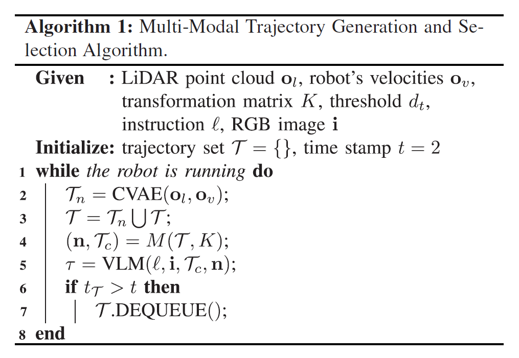 \tau = \text{VL-TGS}(l, i, o, g)으로 표현할 수 있으며, 여기서 o = {o_l, o_v, i}는 로봇의 관측값들을 나타냅니다. o_l \in \mathcal{O}_l은 LiDAR 관측값을, o_v \in \mathcal{O}_v는 로봇의 속도, 그리고 i \in \mathcal{I}는 카메라로부터 얻은 RGB 이미지를 나타냅니다. 마지막으로, l \in \mathcal{V}는 주행 가능한 경로를 획득하기 위해 시각-언어 모델(VLM)에 주어지는 언어 지시어(instruction)를 나타냅니다.