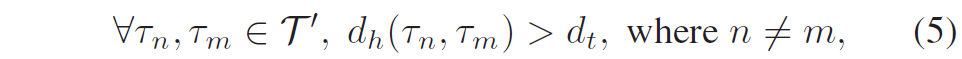 여기서 d_h(\cdot, \cdot)는 두 경로 사이의 하우스도르프 거리(두 곡선이 얼마나 닮았는지 측정하는 지표)입니다. 두 경로의 차이가 d_t보다 클 때만 유의미한 경로들로 판단하며 이는 모양이 거의 똑같은 중복 경로들을 제거하고 시각적으로 명확한 서로 다른 경로들(\mathcal{T}')만 남겨 VLM에게 제공한다고 생각하시면 됩니다.