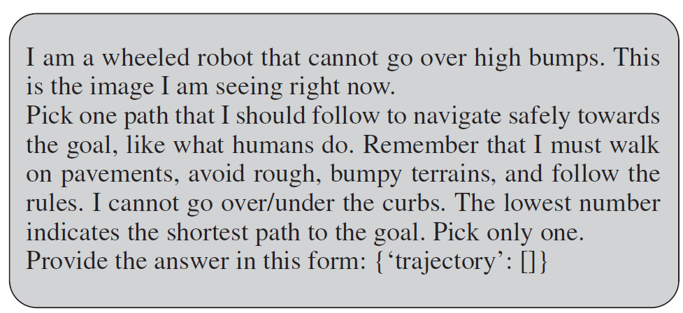 대략적으로 나는 바퀴 달린 로봇이고 높은 턱은 못 넘어간다는 식으로 역할을 부여하고, 사람처럼 안전하게 목표로 가는 경로 하나만 골라라는 임무를 부여합니다. 그리고 반드시 포장된 도로(pavement)로 다녀야 하고, 울퉁불퉁한 곳은 피하고, 연석(curb)은 넘지 마라와 같은 제약조건과 마지막에 숫자가 작을수록 목표에 더 가까운 경로라는 정보까지 함께 텍스트 지시어로 전달해주는 방식입니다.