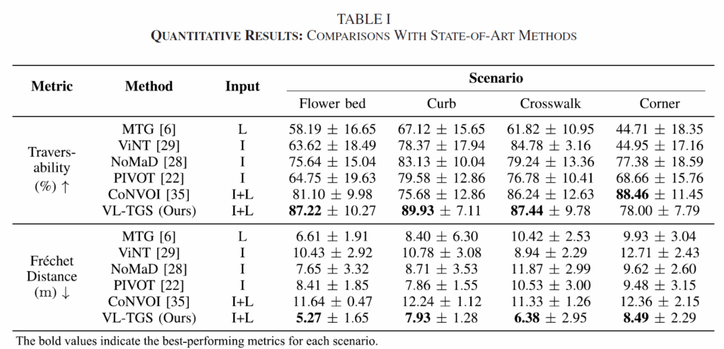 정량적 결과 표입니다. 결론부터 말씀드리면 저자들이 제안하는 방법론이 거의 모든 상황에서 타 방법론들보다 좋은 성능을 보여주고 있습니다. 아무래도 저자들의 방법론은 Image와 Lidar를 모두 사용하다보니 Lidar만 사용하는 MTG나 이미지만 사용하는 NoMaD와 비교해서 당연히 더 좋은 성능을 보여준다고 생각을 했었습니다.