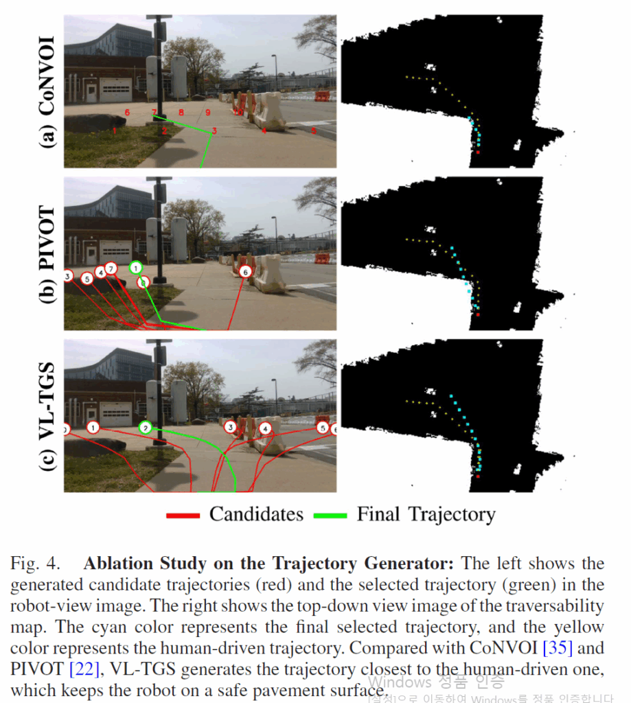 반면에, Fréchet Distance에서는 타 방법론들과 비교해서 나름 경쟁력 있는 성능이 나왔는데 이는 MTG나 VL-TGS 둘 다 부드러운 곡선 형태(Smooth trajectories)의 경로를 생성하며 이게 사람이 조종하는 방식과 비슷하기 때문에 그런 것이라고 합니다.