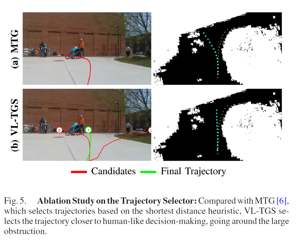 결과는 위의 그림5와 같은데 MTG는 CVAE로 좋은 경로를 만들어내긴 하지만, 선택 기준이 목표점까지의 최단 거리다 보니 동적인 사람 및 사물을 뚫고 지나가는 경로가 가장 짧다고 판단하여 선택해버립니다. 그리고 위의 예시에서는 볼 수 없지만, 저자들이 확인한 바로는 건물을 뚫고 지나가는 경로가 가장 짧다고 판단하여 이러한 잘못된 경로를 선택해버린다고도 하네요.