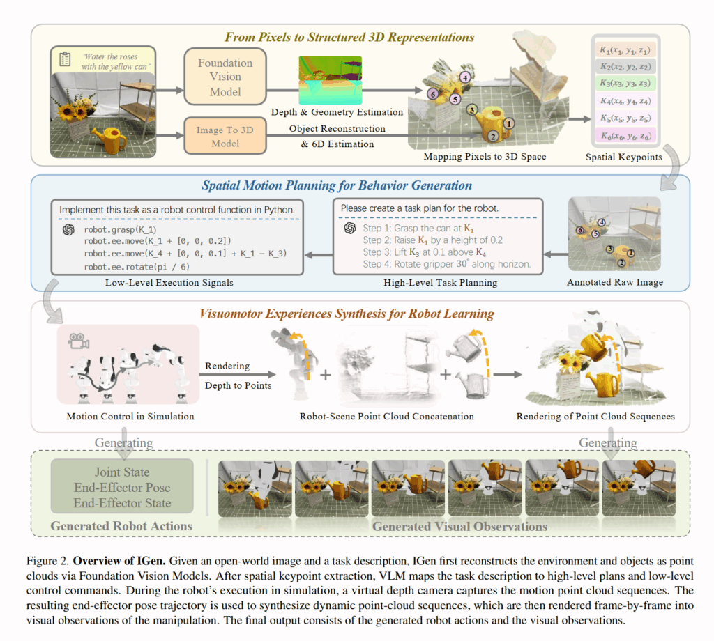 이 문제를 해결하기 위해, 저자들은 IGen이라는 새로운 프레임워크를 제안합니다. IGen은 in the wild 이미지로부터 충분히 현실감 있는 영상 데이터와 그에 대응하는 로봇 액션 시퀀스를 생성할 수 있습니다. 구체적으로 IGen은 대형 비전 모델을 활용하여 2D 이미지를 구조화된 3D 장면 표현으로 변환하고, VLM의 추론 능력을 이용해 장면에 해당하는 task를 순서대로 high-level, low level 명령으로 변환하며, 이러한 명령을 실행하여 시간에 따라 변화하는 영상을 합성합니다. 저자들은 IGen을 통해 얻은 vision-action 쌍의 데이터만을 가지고 학습한 정책이 실제 데이터로 학습한 정책과 비슷한 성능을 보이는 등 해당 방법론으로 생성한 데이터의 품질과 실효성을 확인할 수 있었다고 하빈다. 추가로 Robot Learning from any images 연구와 같이 일반화된 로봇 정책 학습을 위해 오픈월드 이미지로부터 손쉽게 대규모 데이터를 획득하는 새로운 경로를 제시하는 것이라고 강조합니다. 다만 저자들의 방법의 경우 이미지와 text instruction만 있다면 아무런 추가 작업 없이 해당 영상을 통한 데이터 생성이 가능한 것이 강점이라고 볼 수 있을 것 같습니다. 추가로, 기존 로봇의 경험을 잘 학습하지 못한 비디오 생성 모델과 달리, 인터넷 이미지로부터 로봇에게 필요한 행동 정보를 VLM을 통해 생성해 인간의 경험이 담긴 데이터가 아닌 로봇의 경험이 담긴 영상을 생성하고, 그에 따른 retargeting 없이 순수한 로봇의 액션을 그대로 제공할 수 있다는 강점이 있습니다.