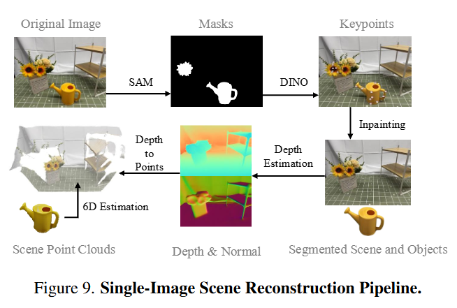 저자들은 먼저 인터넷에 있는 2D 이미지를 로봇의 기준으로 표현 가능한 구조화된 3D 표현으로 변환합니다. 이를 위해 monocular depth estimation 모델 (Metric3D)를 사용하여 depth를 추정합니다. 이 때 2년전의 연구를 활용하는 이유에 대해 고민을 해봤는데, mono depth 서베이 논문을 보니 실제적인 RMSE 성능은 낮아도 일관성 지표에서는 최신 방법론 보다는 강한 모습을 보여서 그런 것이 아닌가 하고 추측해봅니다. 이후 LLM 프롬프팅을 통해 text instruction에서 실제로 이미지 내에 존재하는 상호작용 대상에 대해서 분할을 진행해줍니다. 이후 마스킹된 이미지 (객체들)에서 SAM과 DINOv2 를 통해 feature embedding들을 얻고, 해당 임베딩들과 그에 해당하는 3차원 좌표에 Kmeans clustering을 적용하여 공간 정보를 담고있는 키포인트들을 추출합니다. 이후 너무 많은 후보들을 추려내기 위해 mean shift clustering 또한 진행해줍니다.(여기까지는 ReKep의 구조와 매우 유사합니다.) 이렇게 작업을 수행하기 위해 필요한 객체들의 2D, 3D 키포인트들을 추려냅니다. 이후에는 조작 대상 객체를 따로 분할해 사전학습된 TRELLIS 모델을 통해 3D mesh화를 진행한 후, Color pointcloud로 변환해준다고 합니다. 그뒤에는 Inpainting 모델을 사용해 조작 대상 객체를 지운 배경 사진을 얻고, 이를 같은 depth estimation 모델을 통해 pointcloud로 변환해줍니다. 이후에는 6D estimation 모델을 통해 Full pointcloud를 원래 사진상의 위치에 재배치 해줍니다. 이러한 과정을 거치고 나면 분리된 조작 대상 객체의 full pointcloud, 배경의 pointcloud, 작업 수행을 위해 의미있는 2D, 3D keypoint들을 전부 얻게 됩니다.