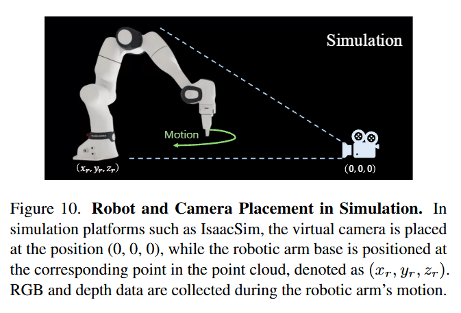 마지막 단계에서, 저자들은 로봇의 action 시퀀스와 동기화된 시각 관찰 데이터를 얻기 위해 실시간 pointcloud 렌더링에 기반한 데이터 합성 기법을 제안했습니다. 앞서 계획된 로봇 행동 시퀀스를 시뮬레이터에서 실행하면서, 가상 카메라를 통해 매 time step마다 RGB-D 프레임을 렌더링하여 로봇의 움직임에 따른 pointcloud 변화를 실시간으로 포착합니다. 이렇게 얻은 로봇과 gripper의 동적 pointcloud 시퀀스와, 변화하지 않는 배경의 정적 pointcloud를 조합하여 전체 장면의 시간에 따른 3D 상태를 표현하였습니다.