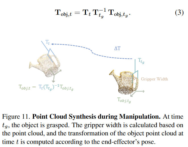 Manipulation에 대한 설명은 아래와 같이 로봇이 물체를 집는 순간부터 그리퍼를 놓을 때까지 (실질적인 상호작용)의 구간에서는 먼저 객체 pointcloud를 기준으로 grasp width를 정해 해당 width만큼만 grasping을 진행한 뒤, 파지 이후의 순간 부터 end effector의 rigid transform에 따라 대상 물체의 포인트클라우드가 함께 이동하도록 Transform을 계산해 로봇이 물체를 쥐고 상호작용하는 상황에서의 장면을 생성해줍니다. 이렇게 얻은 배경, 로봇, 로봇에 따라 움직이는 객체 pointcloud를 통합된 시퀀스로 구성하고, 가상 카메라를 통해 이를 매 프레임마다 렌더링하여 최종적인 visualization 시퀀스를 얻습니다. 최종적으로 open world 이미지 한 장 만으로 task instruction에 해당하는 로봇,액션 페어 데이터를 얻을 수 있게 됩니다.