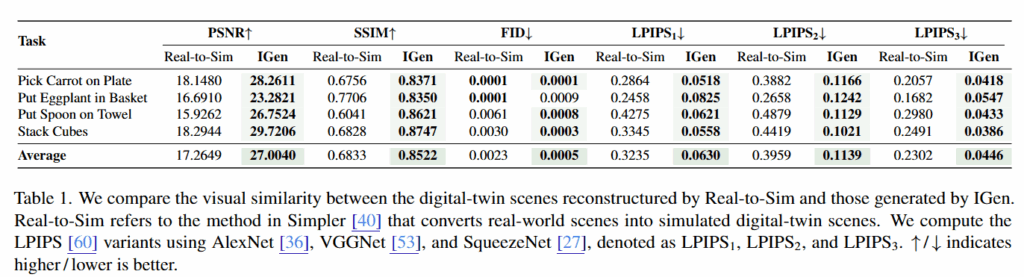 동일한 이미지로부터 Simpler 프레임워크에서 제공하는 Real-to-Sim 방법으로 복원한 결과와 비교 평가했습니다. PSNR, SSIM, FID, LPIPS 등의 다양한 지표를 활용하여 원본 이미지와 재구성된 장면의 일치도를 측정했다고 합니다. Table 1에 나타난 바와 같이 IGen이 모든 지표에서 Simpler의 Real-to-Sim보다 우수한 성능을 보였다고 합니다.
