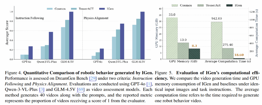 하나의 이미지와 task instruction을 통해 얻은 영상에 나온 객체들이 얼마나 instruction에 맞게 행동하는지, 최근 video world model인 Cosmos, TesserACT와 비교해서 실험했습니다. 비교 대상이 최근 핫한 Sora2나 Wan2.5, Veo3가 아닌것은 조금 아쉽지만 robot behavior를 나타낼 수 없으니 비교 대상에서 제외했다고 합니다. 비디오 모델들이 아직 로봇 자체의 상호작용에 대한 비디오 생성 능력이 부족함을 어필하는 실험입니다. GPT-4o, Qwen3-VL-Plus, GLM-4.5V 모델들을 통해 총 40개의 비디오를 생성한 후 점수를 매겨 0과 1 사이의 숫자로 정규화하여 표현했다고 합니다. 실험 결과 앞선 방법론들 보다 Instruction Following과 Physics Alignment에 대해 점수가 일관되게 높은 것을 확인할 수 있고, 더 나아가 GPU Memory와 Computation Time또한 낮은것을 알 수 있습니다. 다만 뭔가 함정이 있는 것 같은게 우선 비디오 생성 모델들을 활용하게된 가장 큰 이유인 deformable, articulation, 자연스러운 조명 효과나 결과물의 현실성은 평가되지 않았고, computation time 또한 파이프라인의 일부만 계산한 것 같습니다. 현재 코드가 공개되지 않아 직접 구현하는 중인데 단일 4090 GPU로 TRELLIS와 Task Planning 부분만 돌려도 40초 정도가 소요됩니다. 정성적인 결과의 경우 아래와 같이 로봇이 작업하는 모습이 더 유의미하게 반영되는 것은 확인할 수 있습니다.