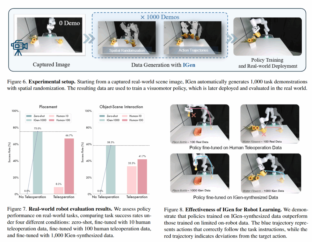 실험 결과, 아무런 teleoperation 없이 각각 10개, 100개의 human teleoperation 데이터보다 1000개의 IGen 데이터를 통해 학습한 경우의 성능이 더 좋은 것을 보이며 IGen의 필요성을 입증했습니다. Figure 8을 통해서는 IGen 데이터로 학습한 정책이 하늘색 경로와 같이 로봇이 지시된 목표를 정확히 따라간 반면, 적은 실제 데이터로 학습된 정책은 빨간색 경로처럼 목표 동작에서 벗어나는 모습을 보이며 teleoperation 데이터보다 훨씬 견고한 모습을 보인다고 주장했습니다.