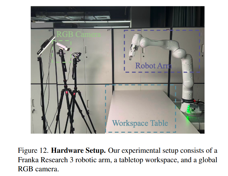 마지막으로, 저자들은 IGen으로부터 얻은 데이터만으로 학습한 정책을 실제 로봇에 적용하여 인간 시연 데이터 없이도 조작 작업을 수행할 수 있는지 검증했습니다. 하드웨어 구성은 위 사진과 같이 Franka Research 3와 전면에 서치된 Microsoft Kinect (RGB only)를 이용했습니다. 모델은 Pi-0을 사용했고, 아무런 finetuning 없이 적용했을 때는 성공률 0%에 가까운 제로샷 성능만 보여 현재 설정에서의 범용성이 제한적임을 먼저 확인해주었다고 합니다. 이후 해당 모델을 real teleoperation 데이터로 finetuning한 경우와, IGen을 통해 생성한 데이터로 finetuning한 경우를 비교했습니다.