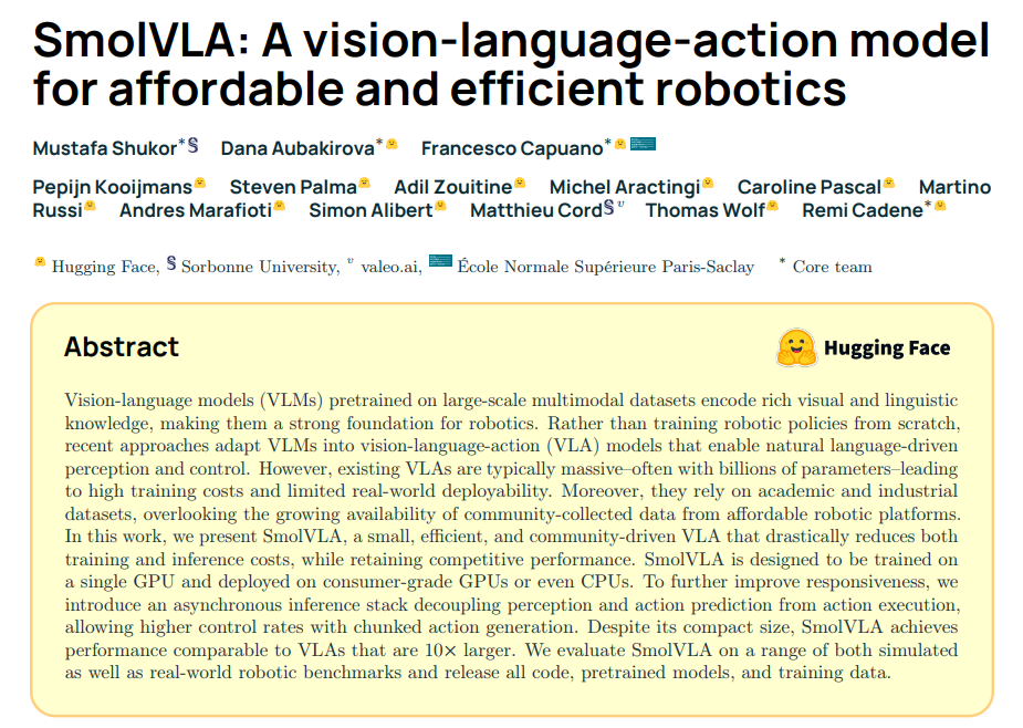 - Title: SmolVLA: A Vision-Language-Action Model for Affordable and Efficient Robotics