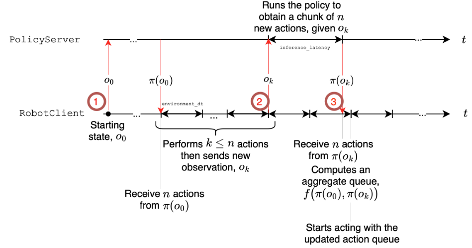 기존의 정책 생성 방식은 액션 청크를 출력하면서 새로운 관찰이 정책에 전달되어 다음 청크를 예측하는 과정(open-loop inference)으로 진행됩니다. 그러나 이렇게 계속 action chunk를 계산하고 다음 action chunk를 덮어쓰는 과정이 비효율적일뿐만 아니라 edge device에 배포가 어렵기 때문에 SmolVLA는 로봇 행동을 하는 부분과 로봇 정책을 생성하는 부분을 분리했습니다. (정식 명칭은 Policy Server과 Robot Client입니다)