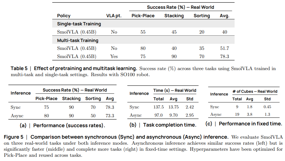 결과적으로 소비자 등급의 하드웨어, 저비용 로봇에서 제어되고 기존 VLA에 비해서 효율적인 VLA 모델 SmolVLA를 제안한다는 내용을 담고 있고, 성공률이 저하되지 않으면서도 반응성이 좋고, 연산량도 기존 방식보다 적다는 것을 이점으로 가지고 있는 모델이라고 합니다.
