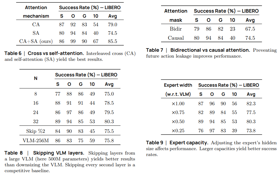 또한 Attention을 CA와 SA를 혼합하여 사용했을 때, mask를 통해 과거만 보고 추론했을 때, VLM layer를 처음 절반만 사용했을 때, action expert의 크기를 0.75 x d로 하는 것이 효율성과 성능 측면에서 좋다고 말하고 있습니다.