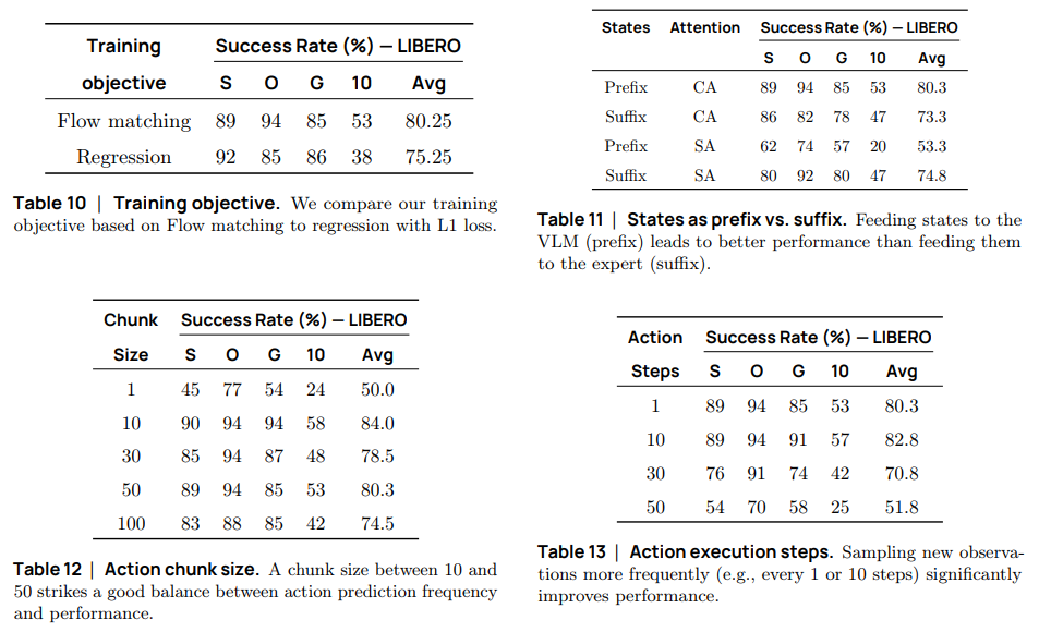 마지막으로 Flow matching 방식을 사용했을 때, State 정보를 VLM에 적용했을 때(Prefix는 VLM에 State를 넣은 경우, Suffix는 Action Expert에만 State를 넣은 경우), 액션 청크 사이즈를 50으로 했을 때, 관측치를 업데이트 하는 정도가 10이 되었을 때 적절한 성공률과 연산량을 얻을 수 있다고 하고 있습니다.