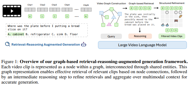 검색 기반 증강 생성(Retrieval-Augmented Generation, RAG)는 자연어 처리 분야에서 대규모 자연어 모델(Large Language Model, LLM)의 context 한계를 극복하기 위해 제안된 방법으로 질문과 관련된 외부 지식을 활용하여 모델의 입력에 추가하는 것으로 성능을 개선하는 방법입니다. 최근에는 이러한 RAG를 비디오에 활용하려는 시도들이 등장했습니다. 긴 영상의 caption을 활용하여 관련된 부분을 검색하여 답변을 하는 방법입니다. 하지만, RAG를 활용하여 영상을 이해하는 방법에는 몇가지 문제가 존재합니다. 첫번째로 긴 비디오를 여러 클립으로 잘라서 각각을 하나의 문서로 활용하여 검색하는 기존의 방법은 긴 비디오 속 객체들의 연속성 혹은 시간적 맥락이 연결이 되지 않아 정확한 추론에 방해가 된다는 문제가 존재합니다. 두번째로 RAG를 활용하는 긴 비디오 이해는 GPT와 같은 거대 폐쇄형 LLM(오픈소스로 공개되지 않은 LLM)에 의존하여 multi-turn 상호작용과 계획을 수행하는 planning agent 방식을 사용하는데 이는 비용이 높고, 또 유연성이 떨어진다는 단점이 존재합니다. 마지막으로 많은 기존 방법론들이 긴 비디오 내에서 일부 핵심 프레임만을 활용하기 때문에 영상의 장면 전환이나 맥락적 연결성을 놓친다는 문제가 존재했습니다. 따라서 RAG를 비디오에 활용함에도 불구하고 기존 긴 비디오 이해 연구의 단점인 긴 비디오의 정확한 내용을 파악하고 일관된 추론을 하지 못한다는 단점을 극복했다고 말하기 어렵습니다.