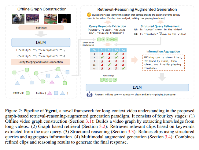 이러한 문제를 해결하기 위해서 저자는 Vgent 방법론을 제안합니다. Vgent는 그래프 기반 검색, 추론, 증강, 생성RAG 프레임워크로 추가적인 훈련 없이 기존 LVLM의 성능을 향상시키는 방법론 입니다. 핵심 아이디어는 그래프 기반 영상 표현을 활용하여 영상을 구조적 그래프 형태로 표현하고 비디오 클립을 노드로 삼아 공통적으로 등장하는 객체나 장면을 연결하여 비디오 클립 사이의 의미적 관계와 시간적 의존성을 보존합니다. 이렇게 구축된 영상 지식 그래프(video knowledge graph)는 오프라인으로 한번만 만들어두면 동일한 영상에 대해 여러 질문이 들어오게 되더라도 그래프를 활용하여 여러 질문을 재사용할 수 있어 매 질문마다 영상을 처음부터 처리하지 않아도 된다는 효율성 또한 제공할 수 있습니다.