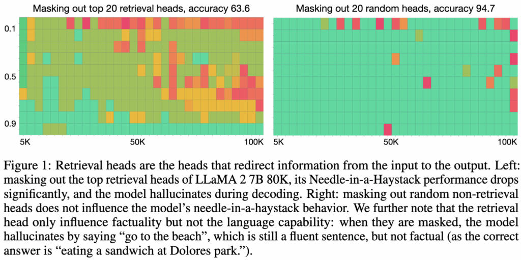 저자들은 4개 모델 패밀리, 6가지 모델 스케일, 그리고 3가지 파인튜닝 설정에 걸친 실험을 통해 관찰 결과를 제시합니다. 분석 결과 트랜스포머의 여러 어텐션 헤드 중, 극히 일부의 헤드만이 질문에 필요한 정보를 직접 찾아내고, 입력 토큰을 출력으로 연결하는 역할을 수행한다는 것을 발견했습니다. 저자들은 이 헤드들을 retrieval head라고 부릅니다. 중요한 점은, 이 retrieval head가 활성화되느냐에 따라 모델의 출력이 사실에 근거한 답변인지, 아니면 환각(hallucination)인지가 거의 결정된다는 것입니다. 해당 헤드가 활성화되면 모델은 입력 문서에 근거한 답을 내놓지만, 활성화되지 않거나 실험적으로 마스킹되면(Fig. 1) 모델은 필요한 정보를 찾지 못하고 그럴듯한 거짓 답을 만들어냅니다.
