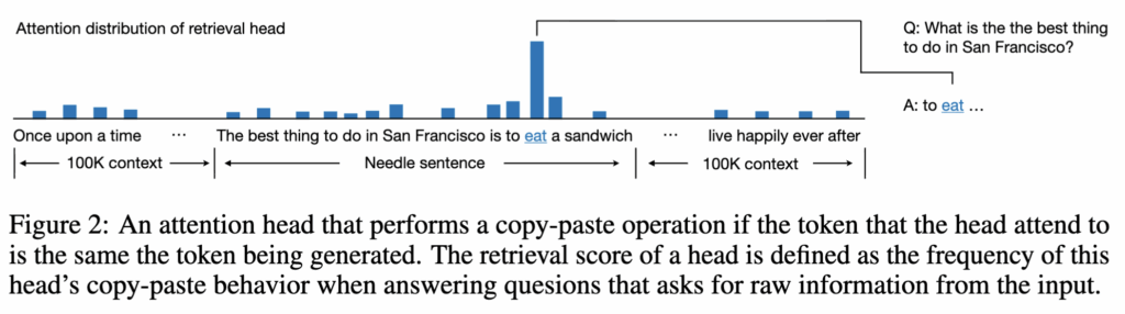 이 발견은 “모델이 바늘을 제대로 찾을 때와 못 찾을 때, 어텐션 메커니즘 내부에서는 무슨 일이 벌어지고 있는가?”라는 질문에서 출발합니다. 저자들은 이 문제를 이해하기 위해 두 가지 선행 연구에서 중요한 영감을 얻습니다. 하나는 RNN 시대의 CopyNet으로, 입력 토큰을 출력으로 복사하는 단일 헤드 어텐션 구조입니다. 다른 하나는 트랜스포머 내부에서, 앞에서 본 패턴을 다시 만나면 그걸 따라가도록 돕는 Induction Head입니다. 이 두 관찰을 종합해 저자들은, 인컨텍스트 러닝에 induction head가 핵심적인 역할을 하듯, 정보 검색을 담당하는 특수한 어텐션 헤드가 존재하며, 이들이 조건부 copy-paste 알고리즘을 구현하고 있을 것이라는 가설을 세웁니다.