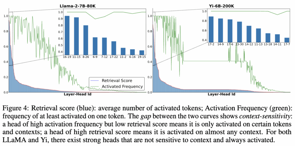 이를 정량화하기 위해 저자들은 activation frequency라는 개념을 도입합니다. 이는 한 헤드가 최소 한 개 이상의 토큰에서 활성화되는 빈도를 의미합니다. activation frequency는 높지만 retrieval score가 낮은 헤드는, 특정 토큰이나 특정 문맥에서만 선택적으로 활성화되는 헤드라고 해석할 수 있습니다.