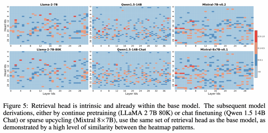 - Intrinsic: retrieval head는 후속 학습으로 새로 만들어진 게 아니라, base model 단계에서 이미 내재적으로 존재하며, 이후 파생 모델들도 대체로 같은 head들을 재사용한다.