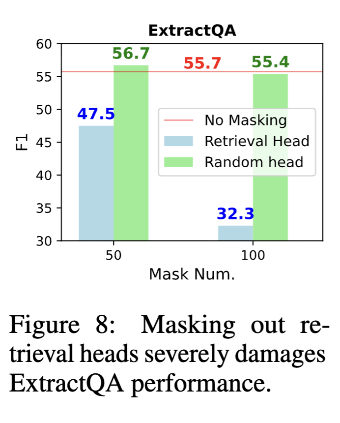 Figure 8에서 보듯, 무작위 non-retrieval head를 마스킹해도 성능에는 거의 영향을 주지 않습니다. 반면 retrieval head를 마스킹할 경우 F1 점수가 각각 9.2%, 23.1%까지 크게 감소합니다. 이 결과는 실제 문서 기반 QA 과제가 retrieval head의 기능에 강하게 의존하고 있음을 보여줍니다.