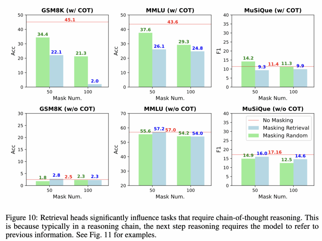저자들은 더 나아가 chain-of-thought 추론 역시 retrieval head에 크게 의존한다는 점을 지적합니다. 모델이 단계적 추론을 수행하려면, 중간중간 입력 정보를 다시 참조해야 하는데, 이 과정에서도 retrieval head가 핵심적인 역할을 한다는 것입니다.