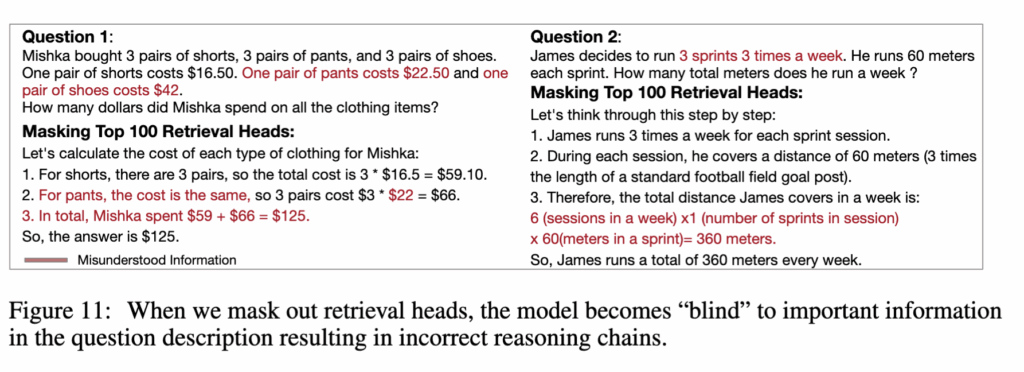 반면 chain-of-thought 방식의 추론에서는 retrieval head를 마스킹할 경우 성능이 눈에 띄게 저하됩니다. 대표적인 오류 사례를 살펴보면(Fig. 11), 모델이 입력에 포함된 중요한 정보를 전혀 참조하지 못한 채 환각을 일으키는 모습을 보입니다.