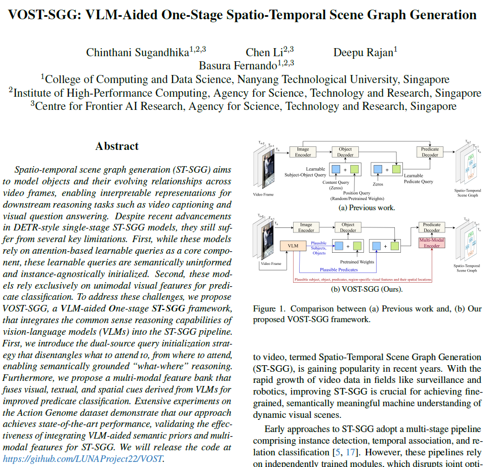 안녕하세요, 허재연입니다. 오늘도 Video Scene Graph Generation 논문을 가져 왔습니다. 포멧과 공개 시기를 미루어 보아 CVPR2026에 제출된 논문이 아닐까 하네요. 지금까지의 방법론들과는 다르게 VLM의 정보를 활용합니다. LLM을 적용하려는 시도는 이전에도 있었는데 VLM(Qwen2.5-VL-7B-Instruct 사용)을 적극적으로 도입한 논문은 많지 않았기에 재밌게 읽었습니다. 그럼 리뷰 시작하겠습니다.