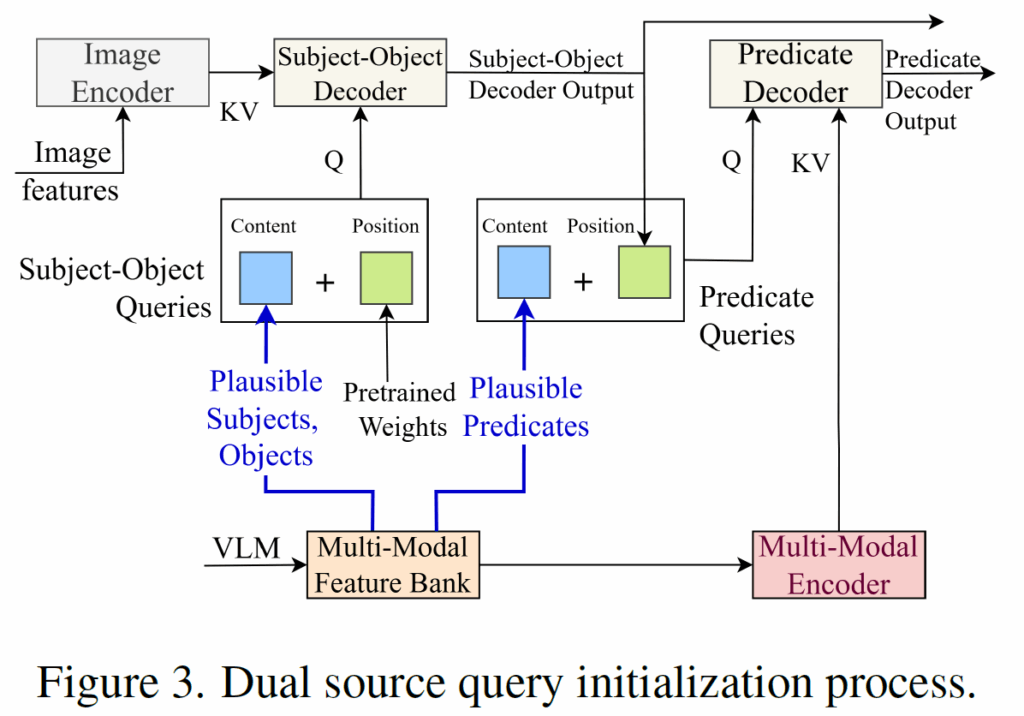 저자들은 순수한 공간적 추론(‘어디’)을 ‘무엇’과 ‘어디’를 결합한 의미론적 근거를 제공하는 공간 추론으로 발전시키기 위해 dual source query initialization을 사용해 위의 두 문제를 완화합니다(추가적인 inductive bias를 제공하는 것이죠). position query가 계속 어디를 볼지 가이드하는 동안, VLM에서 추출한 상식 정보로 개연성 있는 object 및 predicate를 만들어 ‘무엇을’ 찾을지 정의하는 semantic cue로 사용하여 content query에 보다 풍부한 정보를 제공합니다. 이런 고수준 개념어(person, hold, cup 등)은 각 쿼리에 검색할 relational triplet 유형에 대해 명확한 시작점을 제공해서 검색 공간을 효율적으로 좁히고, 추가적인 정보 정제의 품질을 높이는 사전 정보 역할을 하게 됩니다.