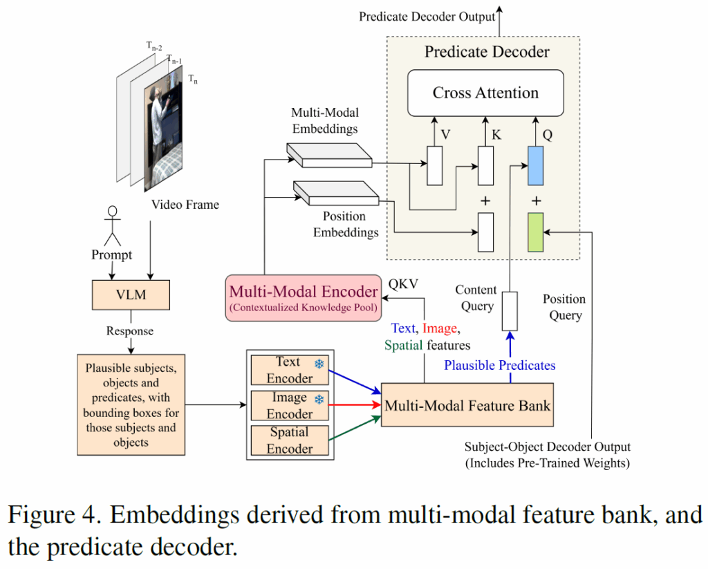 제안된 멀티모달 인코더는 텍스트, 시각, 공간적 상식 근거에 기반한 frame-specific한 문맥 표현을 생성하여 강력한 predicate 분류를 가능하게 합니다. content 쿼리에 VLM에서 뽑은 물체에 대한 의미를 전달하여 각 쿼리에 의미론적으로 ‘사람 앞의 소파’와 같은 시작점을 제공해 예측을 돕는 것이죠. (VLM 출력은 초기화 역할만 하게 됩니다)