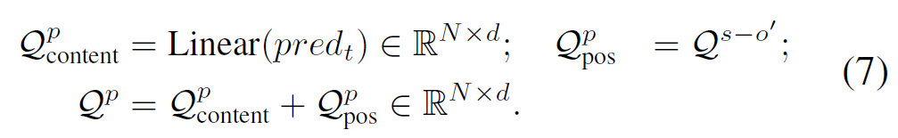 predicate decoder에서, 관련 predicate embedding {pred}_{t} 을 content query에 할당하고, 학습된 <subject-object> 쿼리 출력 {Q}^{s-o'} 가 position query 역할을 하도록 하여 수식 (7)과 같이 predicate query {Q}^{p}를 생성합니다.