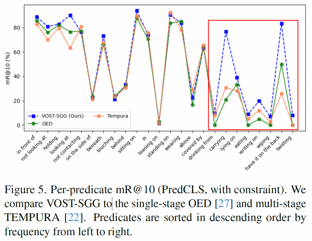 방법론이 3가지로 섹터로 나뉘어져 있는데, 맨 윗칸 방법론들은 이미지 기반 SGG 방법론들을, 가운데 칸 방법론들은 2-stage Spatio-Temporal SGG 방법론들을, 맨 아래 OED, VOST-SGG는 1-stage 방법론들입니다. 기본적으로 1-stage 방법론들이 성능이 좋고, 제안하는 VOST-SGG가 Recall 및 Mean Recall에서 모두 가장 좋은 성능을 달성하였습니다. 특히 그림 5에 나타난 것처럼, head class의 성능을 희생시키지 않고 ‘닦기(wiping)’, ‘위에 쓰기(writing on)’, ‘등에 지기(have it on the back)’, ‘비틀기(twisting)’같은 tail쪽에 분포된 predicate의 성능이 개선됨을 확인했습니다(가장 오른쪽에 있는 8개의 predicate는 데이터셋에서 희소한 클래스들입니다). 제안 방법론이 롱테일 분포의 한계를 기존 방법론들보다 강건하게 대응할 수 있음을 보여준다고 합니다.