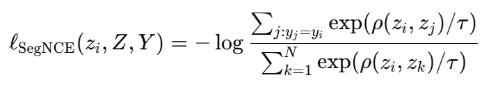 각 feature z_i∈Z 는 대응되는 segmentation label y_i∈{1,…,C}를 가지며, feature map 해상도가 낮을 경우 segmentation map을 nearest-neighbor downsampling으로 맞춰서 진행했다고 합니다. 저자들은 SegNCE loss를 아래와 같이 정의했습니다.