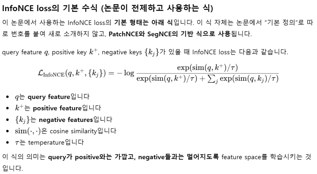 파이프라인은 Figure 2와 같이, unpaired real (고정뷰), sim (다양한 카메라뷰 + segmentation map) 이미지들을 사용하고, simulation에서의 viewpoint 정보가 translation 과정에서 유지되도록 하기 위해 segmentation-based InfoNCE loss, modified PatchNCE loss, 그리고 discriminator를 정규화하기 위한 random patch sampling 및 patch-wise random rotation을 사용한다고 합니다. 아래는 이해를 위해 저자가 활용하는 InfoNCE loss 식에 대해 GPT가 설명해준 내용인데 참고하시면 좋을 것 같스빈다.