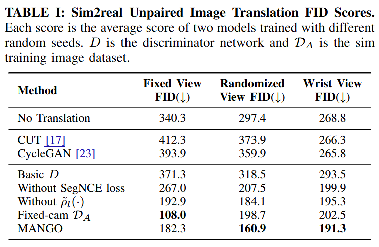 Table 1을 보면 일단 MANGO는 Randomized View test set에서 가장 낮은 FID를 보여주었습니다. 저자들은 특히 discriminator 설계가 모든 test set에서 FID에 가장 큰 영향을 미쳤다고 설명했습니다. 또한 SegNCE loss를 제거하거나 modified PatchNCE의 scoring function 을 사용하지 않을 경우, FID가 크게 악화됨을 보였습니다. 이를 통해 저자들은 viewpoint-preserving translation에는 SegNCE, modified PatchNCE, 그리고 강하게 regularized된 discriminator가 모두 필수적이라고 결론지었습니다. 저자들은 Table 1의 FID 값이 일반적인 computer vision benchmark보다 높은 이유로 robotics scene이 out-of-distribution이며 test set 규모가 작기 때문이라고 합니다.