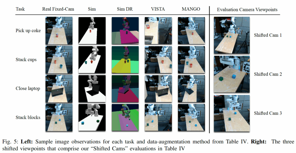 이러한 고정 카메라 데이터의 한계를 극복하기 위해, 저자들은 시뮬레이션 기반 데이터 증강 접근을 제안했습니다. Digital twin 환경에서 다양한 카메라 시점에서 시뮬레이션 데모를 수집한 뒤 시뮬레이션 영상들을 실제 이미지로 변환해주는 transfer 모델을 학습해 sim2real gap을 메우는 Multiview Augmentation with Novel Generated Observations (MANGO)를 제안했습니다. 이름처럼 MANGO는 멀티뷰의 새로운 관측 데이터를 생성하여 데이터셋을 확장하는 방식으로 증강합니다.