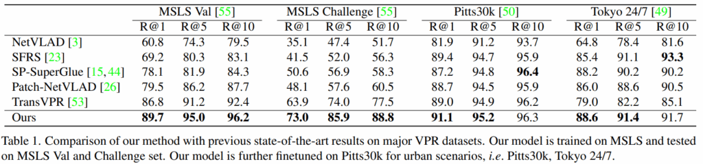 평가 데이터셋은 MSLS의 Val / Challenge set, Pitts30k, Tokyo 24/7, R-SF, St Lucia.