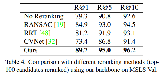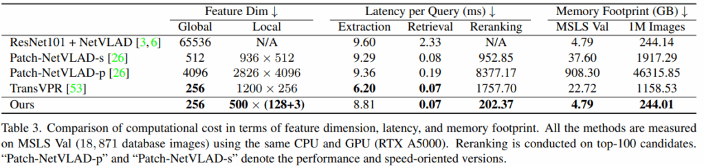 기존 Reranking 방법론들은 주로 RANSAC기반의 Geometric Verification을 사용합니다. CPU에서 작동하는 RANSAC과 다르게 R2Former은 GPU상의 Forward Pass 한번으로 동작하기에 병렬처리에 용이하고 기존 방법론 대비 20배 빠르다고 주장하고 있습니다. 그리고 이미지당 Top-500개의 local feature만 저장하기에 메모리 역시 189배 절감할 수 있다고 주장합니다.