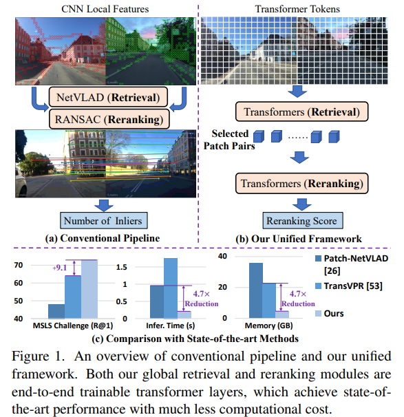 그리고 R2former는 backbone으로 기존 CNN이 아닌 ViT를 선택했습니다. 최근 연구들이 VPR에서 ViT가 강한 성능을 보이기에 선택했다고 얘기하지만, 특이하게도 local한 영역을 보기에 local information이 encode되는 CNN계열과 다르게 ViT계열은 global한 receptive field를 가지기에 local한 matching을 바로 진행하기 어렵다고 지적하고 있습니다.