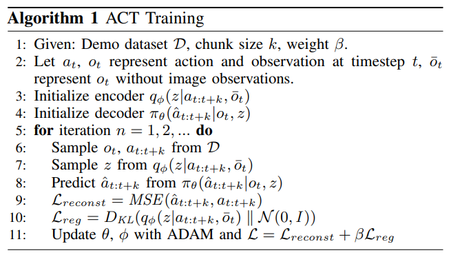 학습 알고리즘은 위와 같이 구성되어 있습니다. 해당 부분에서 강조되는 내용은 Action Chunking입니다. Action Chunking은 개별 액션이 함께 그룹화되어 하나의 단위로 실행되어 저장 및 실행이 더 효율적으로 이루어지는 신경 과학 개념이라고 합니다(논문 내의 문장). agent는 매 k 단계마다 observation을 수신하고 다음 k 액션을 생성하고 액션을 순서대로 실행합니다. 이는 작업의 유효 범위가 독립된 액션을 예측하는 것이 아니라 일정한 흐름이 있는 것을 예측하기에 계산이 k배 감소함(?)을 의미합니다.