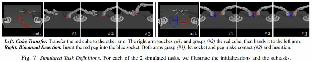 해당 논문에서는 정밀 조작 테스크에서 ACT의 성능 평가를 위한 실험도 제시를 합니다. ALOHA를 이용한 6개의 실제 세계 테스크 외에도 MuJoCo에서 두개의 시뮬레이션 된 정밀조작 테스크를 구축하여 이에 대한 평가를 진행합니다. Task의 종류는 아래와 같습니다.