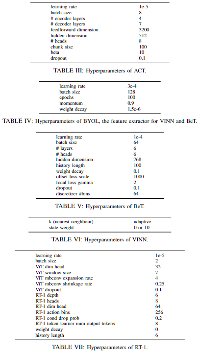 ACT, BeT, VINN에서 사용되는 시각적 특징 추출기는 시연 데이터로 fine-tuning된 ResNet을 사용하며, 각 방법의 하이퍼파라미터 설정은 아래와 같습니다.