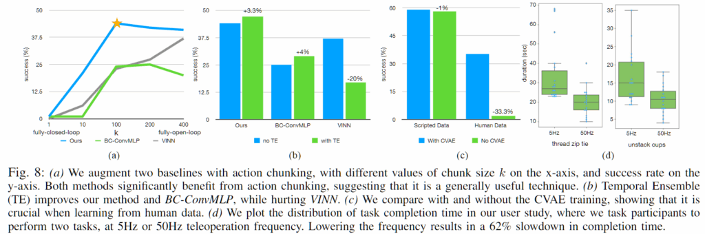 결과적으로 해당 논문에서는 텔레오퍼레이션 시스템 ALOHA와 새로운 모방 학습 알고리즘 ACT로 구성된 정밀 조작을 위한 저비용 시스템을 제시했습니다. 이를 통해서 앞으로 저비용 오픈 소스 시스템이 세분화된 로봇 조작을 발전시키기 위한 중요한 단계이자 접근 가능한 리소스가 되기를 바란다고 하면서 해당 논문을 마치고 있습니다.