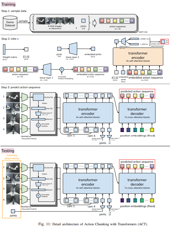 이렇게 만들어진 Z는 CVAE의 Decoder 구조에 들어갑니다. 이때는 resnet을 통과한 feature(15 x 20 x 728)를 flatten 시킨 값을 300 x 512로 맞춘 후 공간 정보를 유지하기 위해 transformer의 positional embedding과 위치에 대한 값을 추가해줍니다. 이를 z, joint 함께 인코더에 넣고 나온 값을 transformer decoder에 K, V로, k step의 시간 정렬을 위한 position embedding은 Q로 들어가서 예측 action sequence를 뽑아내게 됩니다. 여기서 나온 값의 차원은 k x 512 차원이기 때문에 MLP를 통해 k x 14(7 DoF 로봇 2개의 joint)로 down-projection되어 k스텝동안 예측된 target joint positions에 대응하게 됩니다.