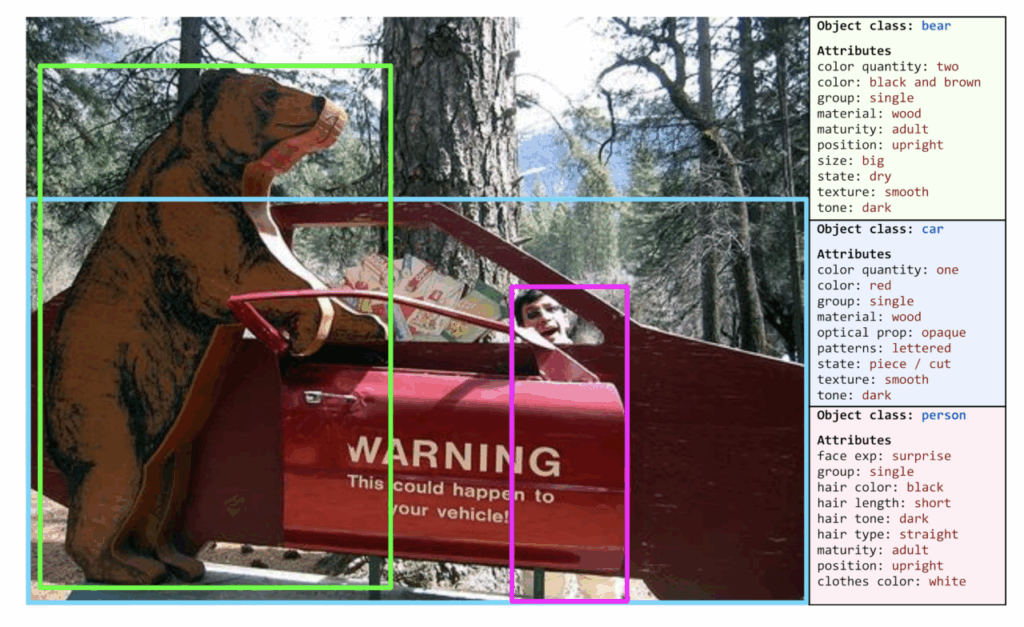 속성(attribute)은 객체의 정체성에 중요한 역할을 합니다. 위 그림에서 초록색 박스를 단순히 곰이라고만 인식하기보다, 나무로 만들어졌다는 정보까지 인식할 수 있다면 그 정보만으로도 이 곰이 모형이고 무해하다는 것을 깨달을 수 있습니다. 따라서 object와 attribute를 모두 탐지하는 모델은 이 두 정보를 결합하여 더욱 풍부하고 상황에 맞는 추론을 가능하게 합니다.