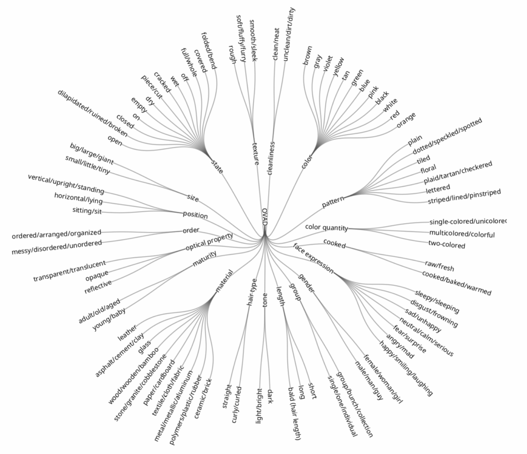 COCO Captions의 캡션에서 형용사를 추출하고 동의어 별로 그룹화한 뒤, 추상적이거나 non-visual한 형용사는 수동으로 제거합니다. 이 과정을 통해 총 117개의 attribute를 얻었고 이들을 19개의 상위 클래스(attribute 유형)로 분류하였습니다. 이 분류 체계의 정확한 구조는 위 그림에서 확인하실 수 있습니다.