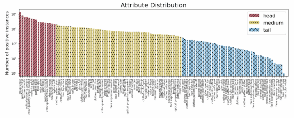 먼저 속성의 분포는 위와 같이 long-tail 분포이기 때문에 head, medium, tail에 대한 성능을 각각 측정하였다고 합니다. head는 16개, medium은 55개, tail은 46개의 attribute class를 포함합니다.