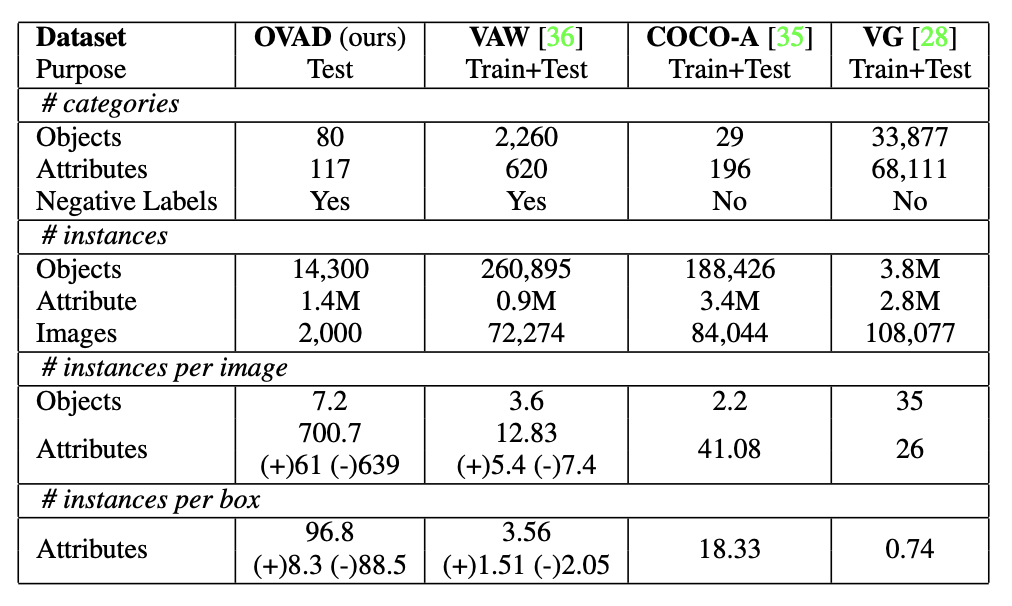 - VAW: 풍부하고 신뢰할 수 있는 positive / negative attribute label을 제공하고, 각 object-attribute 쌍에 대해 최소 50개의 instance가 존재합니다. 그러나 자동 필터링을 사용했기 때문에 이미지 당 인스턴스, 인스턴스 당 attribute의 측면에서는 매우 희소합니다.